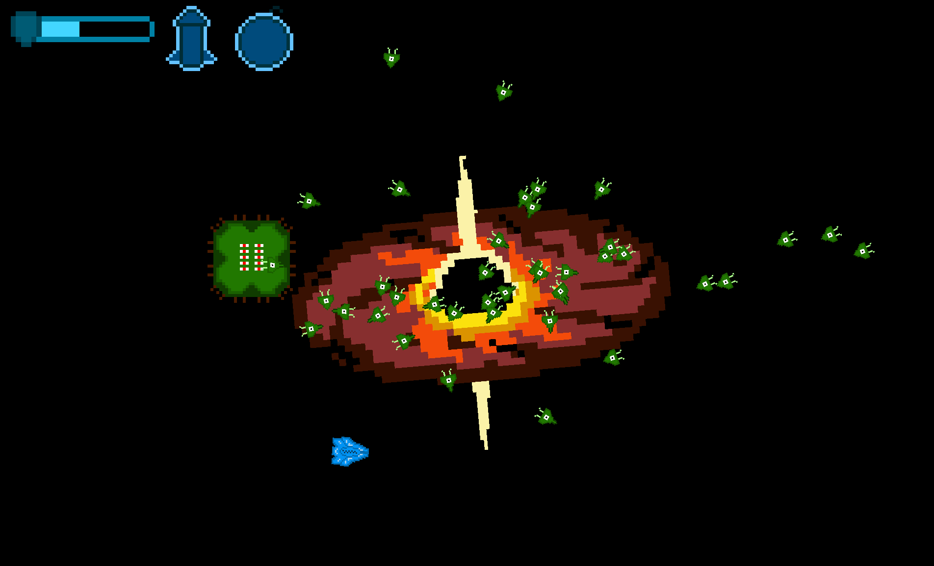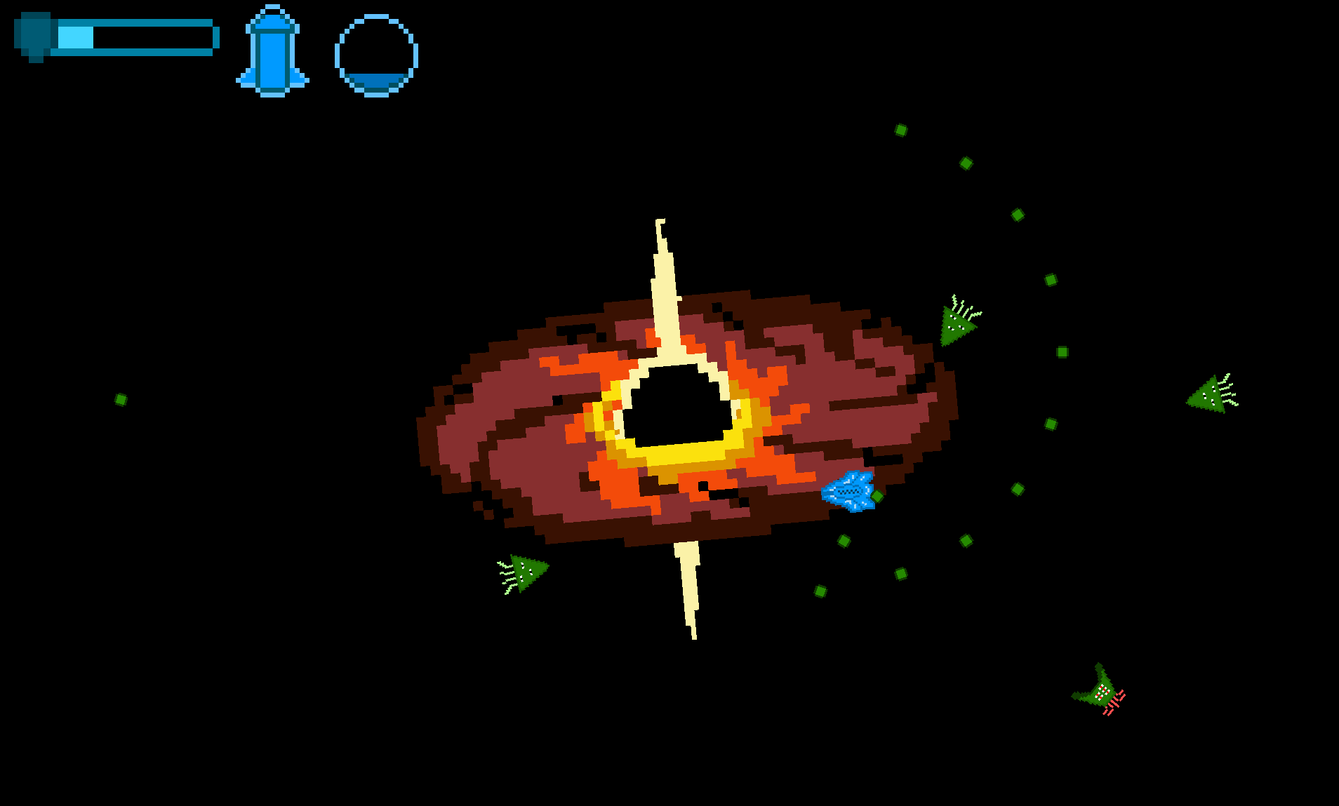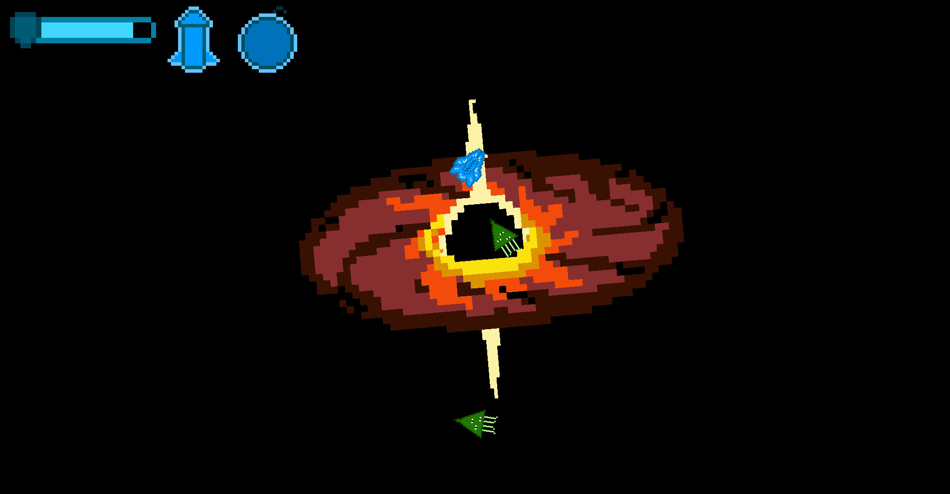 An arcade shoot 'em up similar to asteroids, with focus on a gravity mechanic that makes you orbit the center black hole, which can be annoying but can also be used to your advantage.